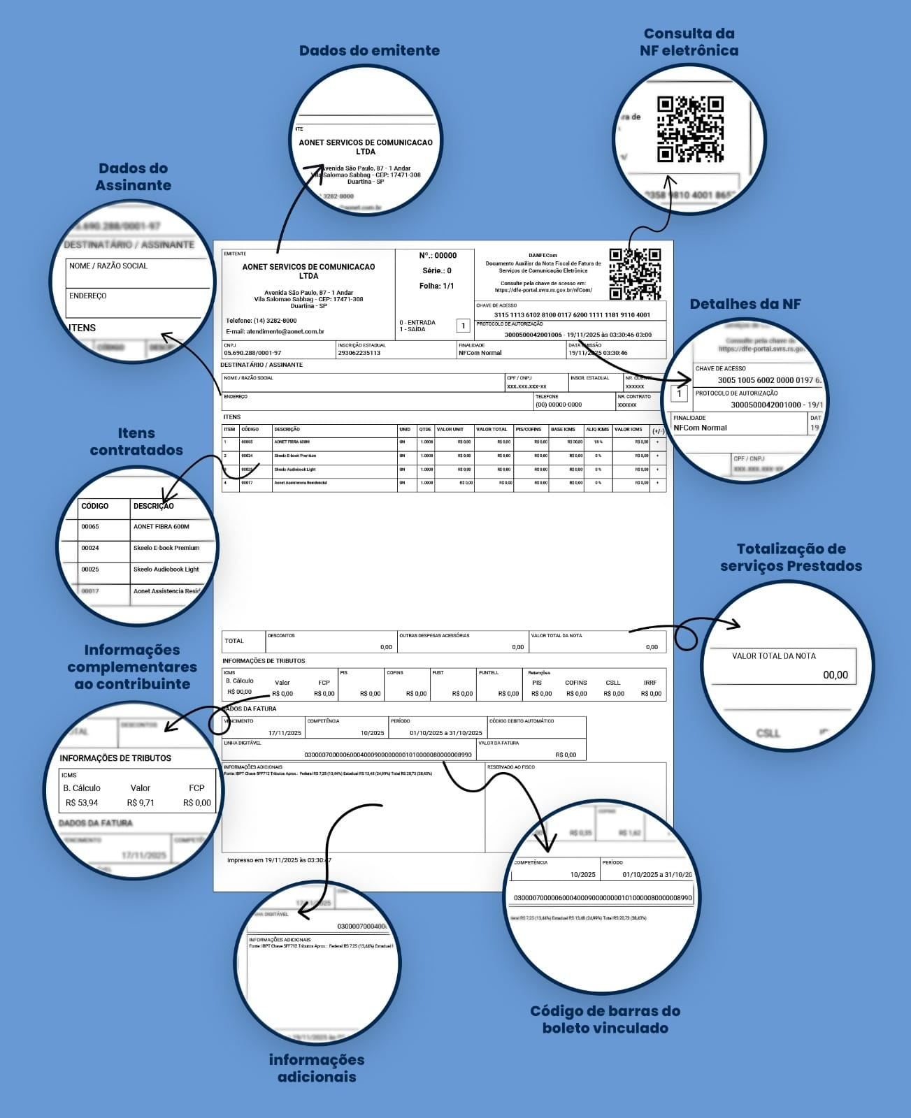 A AONET reafirma seu compromisso com a conformidade fiscal e com a transparência nas relações com seus clientes. Desta forma, em atendimento ao Ajuste SINIEF 7/2022, que instituiu a Nota Fiscal Fatura de Serviços de Comunicação Eletrônica (NFCom), informamos que, a partir de 1º de novembro de 2025, todos os documentos fiscais referentes aos serviços de comunicação prestados pela AONET passarão a ser emitidos nesse novo modelo fiscal.
